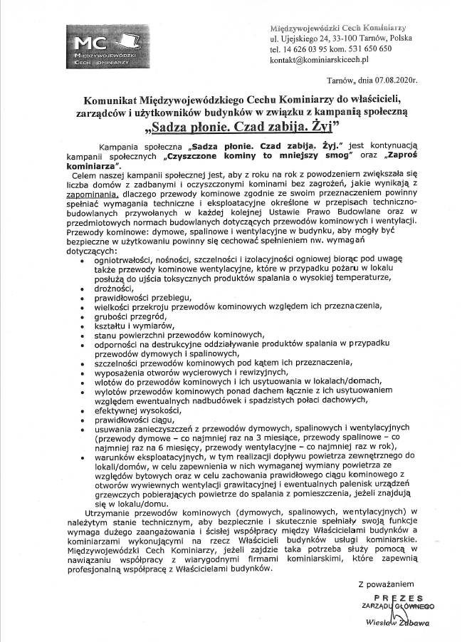 Komunikat Międzywojewódzkiego Cechu Kominiarzy