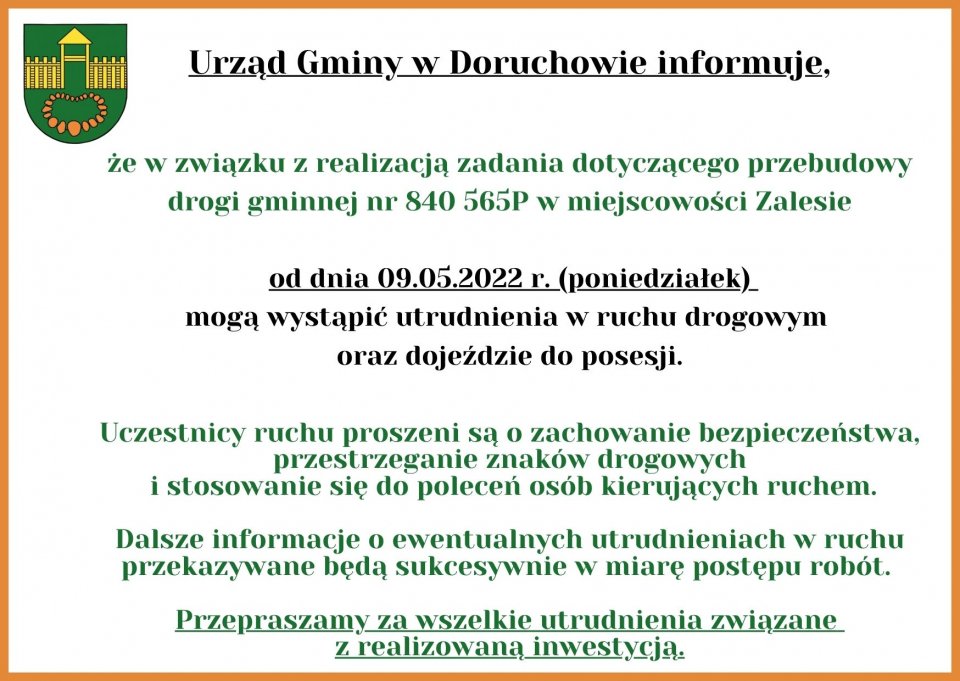 Informacja dotycząca przebudowy drogi gminnej w miejscowości Zalesie-utrudnienia w ruchu drogowym