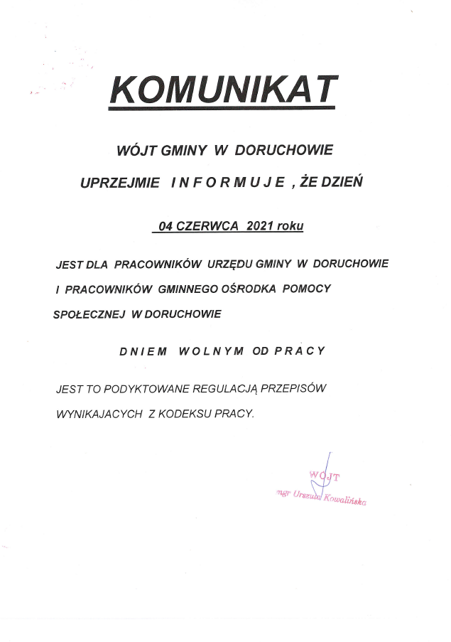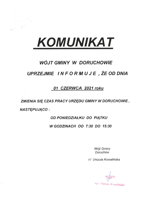 Komunikaty w sprawie działania Urzędu Gminy w Doruchowie
