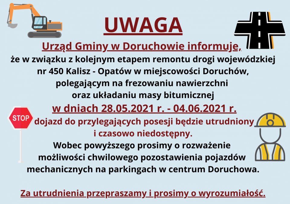 Komunikat w sprawie prac remontowych drogi wojewódzkiej nr 450 Kalisz-Opatów