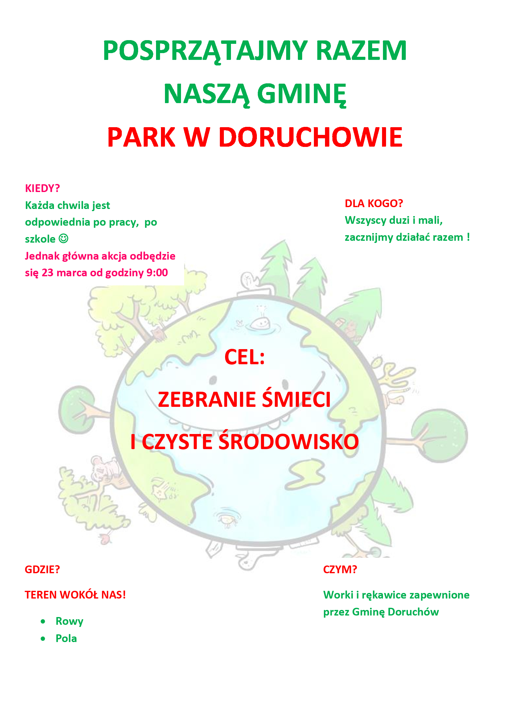 Uprzątnięcie śmieci w swojej okolicy, które sami wytwarzamy to wspaniała inicjatywa, którą należy szerzyć, by żyło nam się zdrowo w czystym środowisku. Zapraszamy i zachęcamy wszystkich mieszkańców, radnych, sołtysów, szkoły oraz inne organizacje funkcjonujące na terenie Gminy Doruchów do wzięcia udziału w tym przedsięwzięciu. Wspólnymi siłami możemy stworzyć naszą gminę jeszcze piękniejszą.