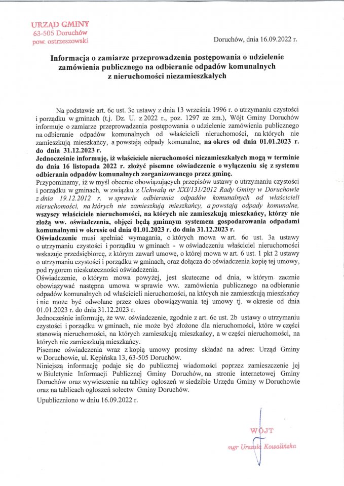 Informacja o zamiarze przeprowadzenia postępowania o udzielenie zamówienia publicznego na odbieranie odpadów komunalnych z  nieruchomości niezamieszkałych