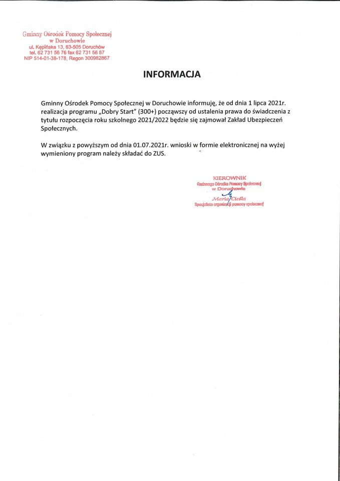 Informacja GOPS w Doruchowie w sprawie programu "Dobry Start"