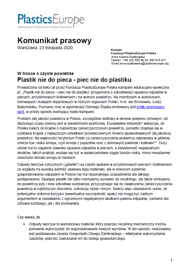 Zapraszamy do zapoznania się z materiałami Fundacji PlasticsEurope Polska, przygotowanymi w ramach kampanii pt. „Plastik nie do pieca – piec nie do plastiku”.