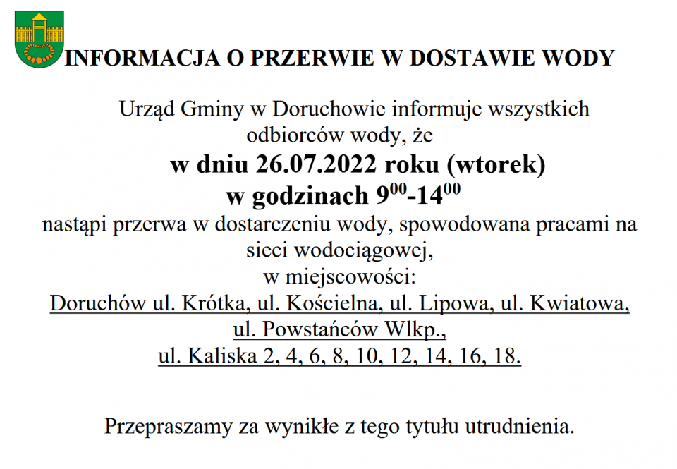 Przerwa w dostawie wody 26 lipca 2022r.