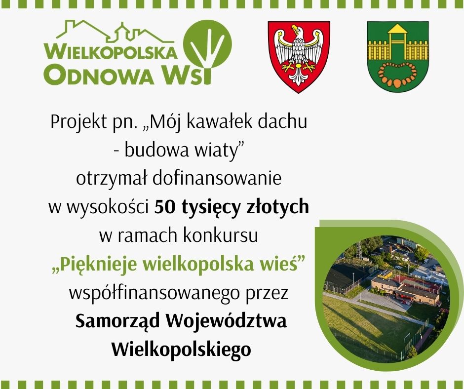 Gmina Doruchów pozyskała dofinansowanie w wysokości 50 tysięcy złotych z Samorządu Województwa Wielkopolskiego w ramach konkursu Pięknieje Wielkopolska Wieś. W ramach XII edycji 170 projektów otrzymało dofinansowanie, które będą realizowane na terenie Województwa Wielkopolskiego. Zgodnie z wnioskiem złożonym przez Gminę Doruchów zakres zadania obejmuje utwardzenie nawierzchni, montaż drewnianej altany i podłączenie do energii elektrycznej. Miejsce realizacji to plac obok pawilonu i sceny przy boisku sportowym.