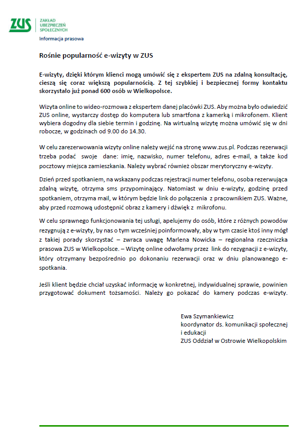 Nowa forma kontaktu klientów z ekspertem ZUS poprzez zdalną konsultację