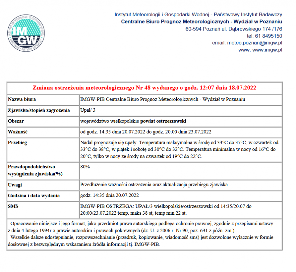 Ostrzeżenie meteorologiczne nr 48 (zmiana) wydane przez Biuro Prognoz Meteorologicznych w Poznaniu.