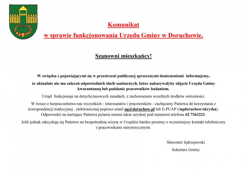 Komunikat w sprawie funkcjonowania Urzędu Gminy.