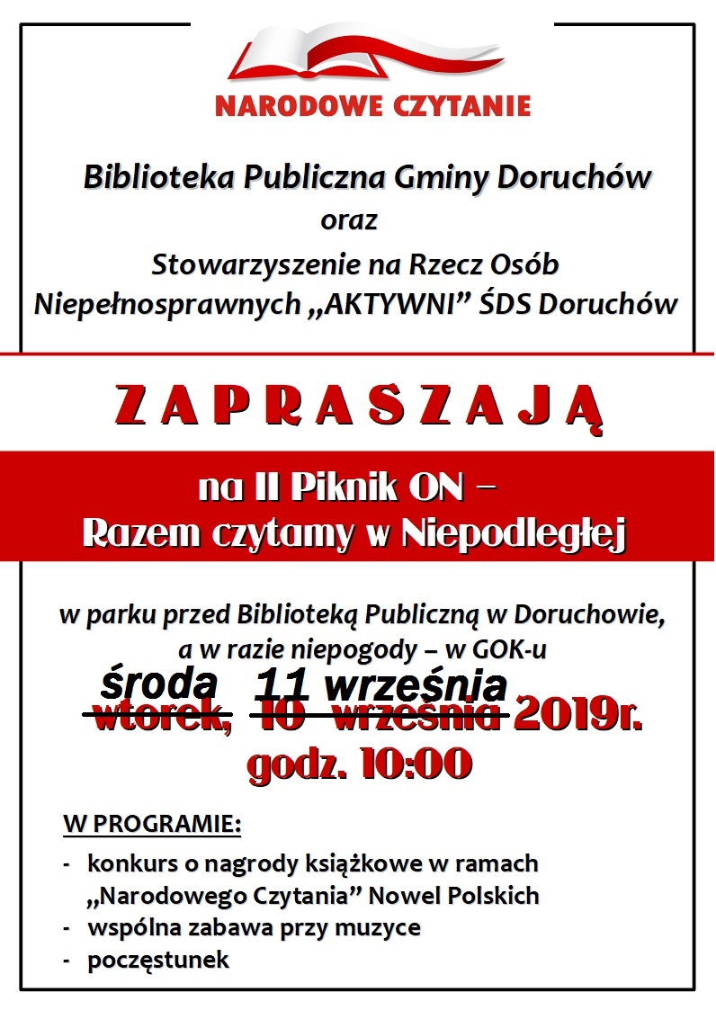 Ze względu na warunki atmosferyczne Piknik Osób Niepełnosprawnych oraz Narodowe Czytanie zostaje przesunięte na 11 września 2019r. (środa).