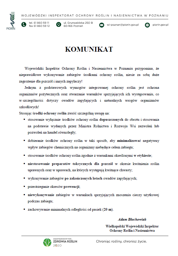 Komunikat WIORiN w Poznaniu-ochrona pszczół