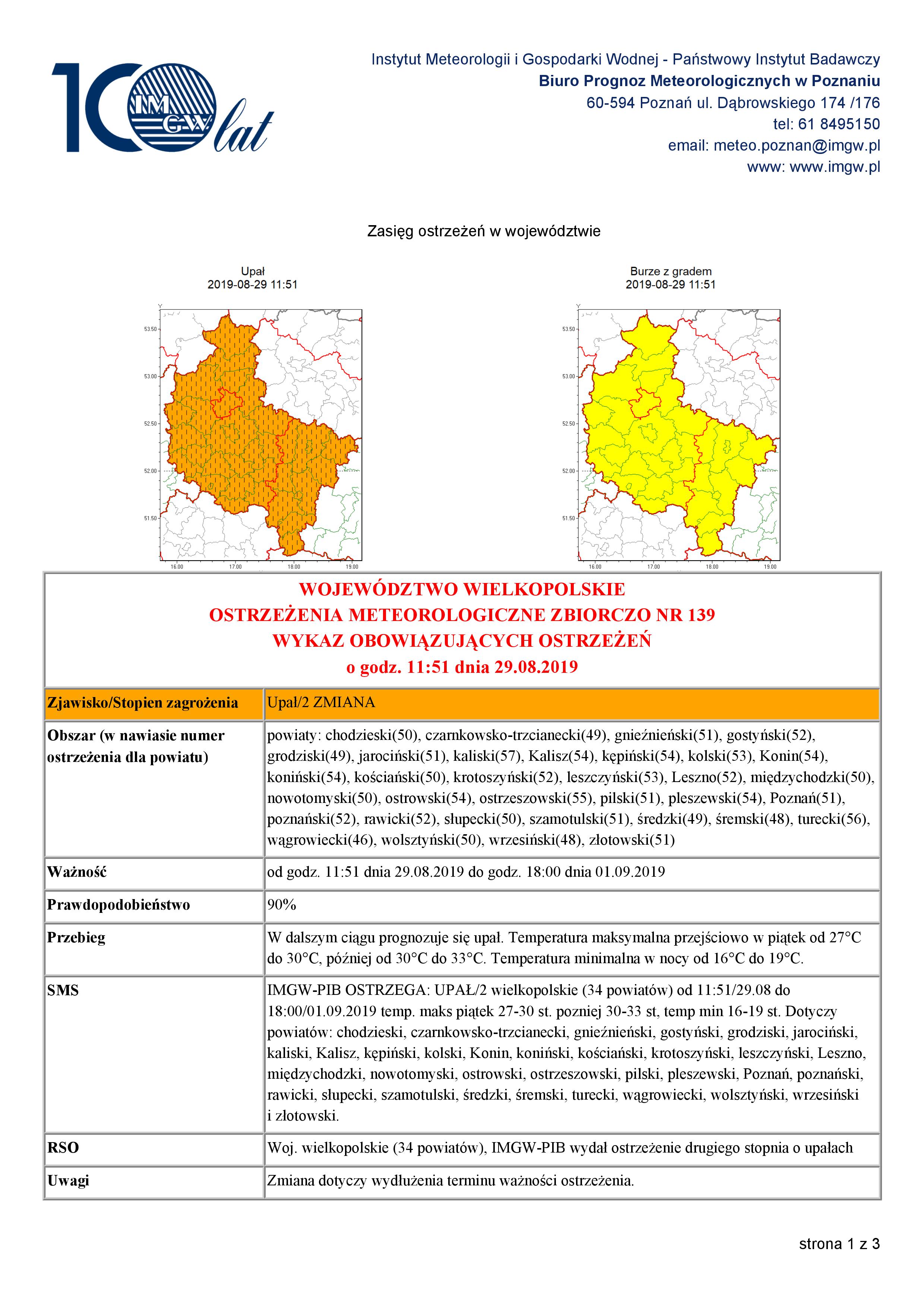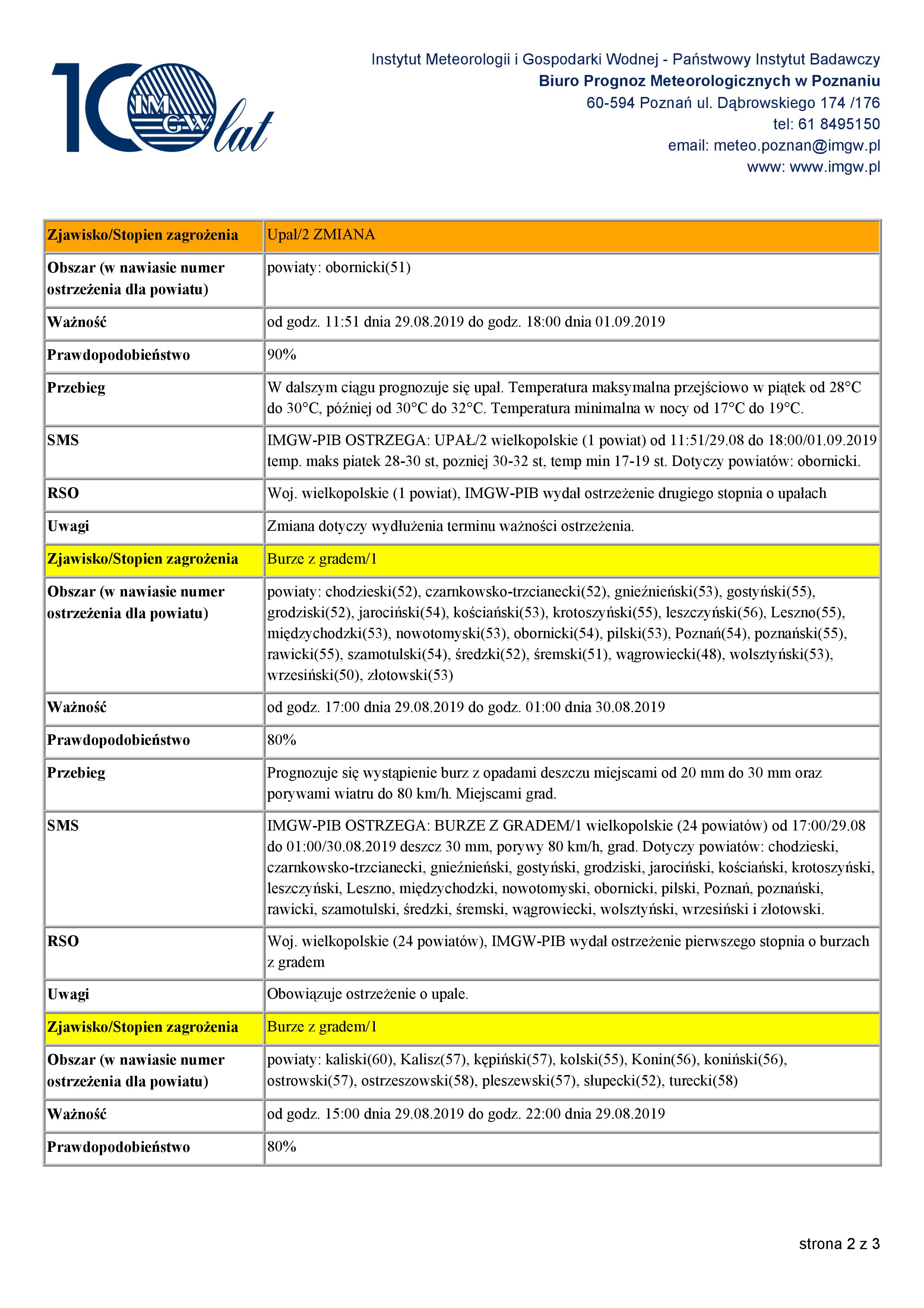 Wojewódzkie Centrum Zarządzania Kryzysowego w Poznaniu ostrzega przed burzami z gradem w dniu 30.08, deszcz 35mm, porywy wiatru do 80 km/h.
