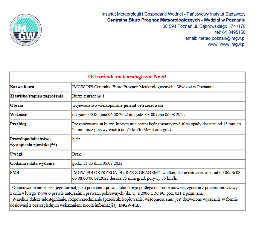 Ostrzeżenie pogodowe 6 sierpnia 2022r.