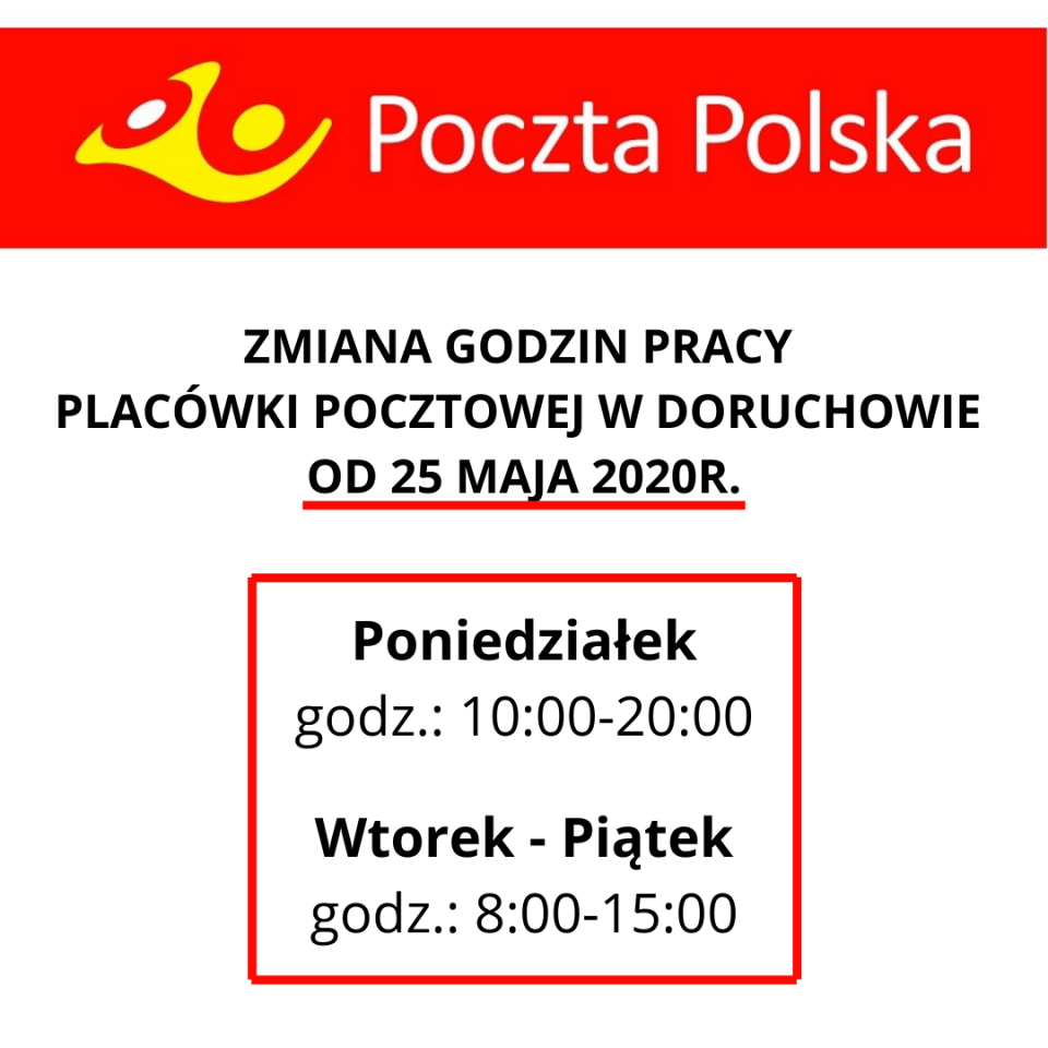 Zmiana godzin pracy placówki pocztowej w Doruchowie od 25 maja 2020r.