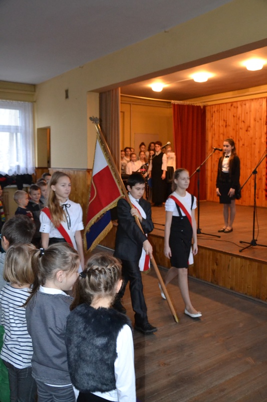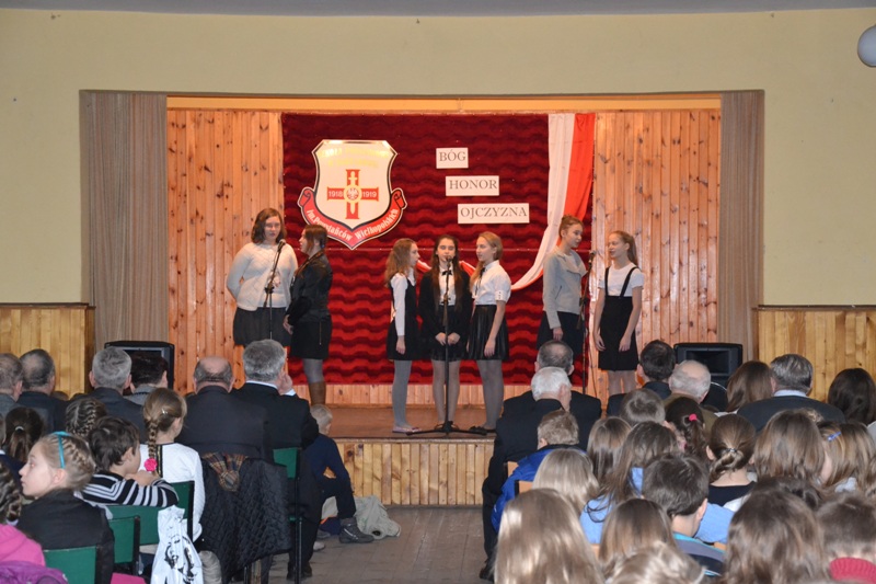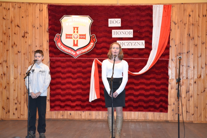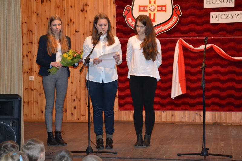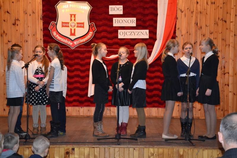 Następnie uroczystość przeniosła się do Sali Gminnego Ośrodka Kultury w Doruchowie, gdzie uczniowie przedstawili historię wybuchu Powstania Wielkopolskiego i przybliżyli wszystkim obecnym na sali tamte wydarzenia i ludzi dzięki którym Polska jest państwem niepodległym.