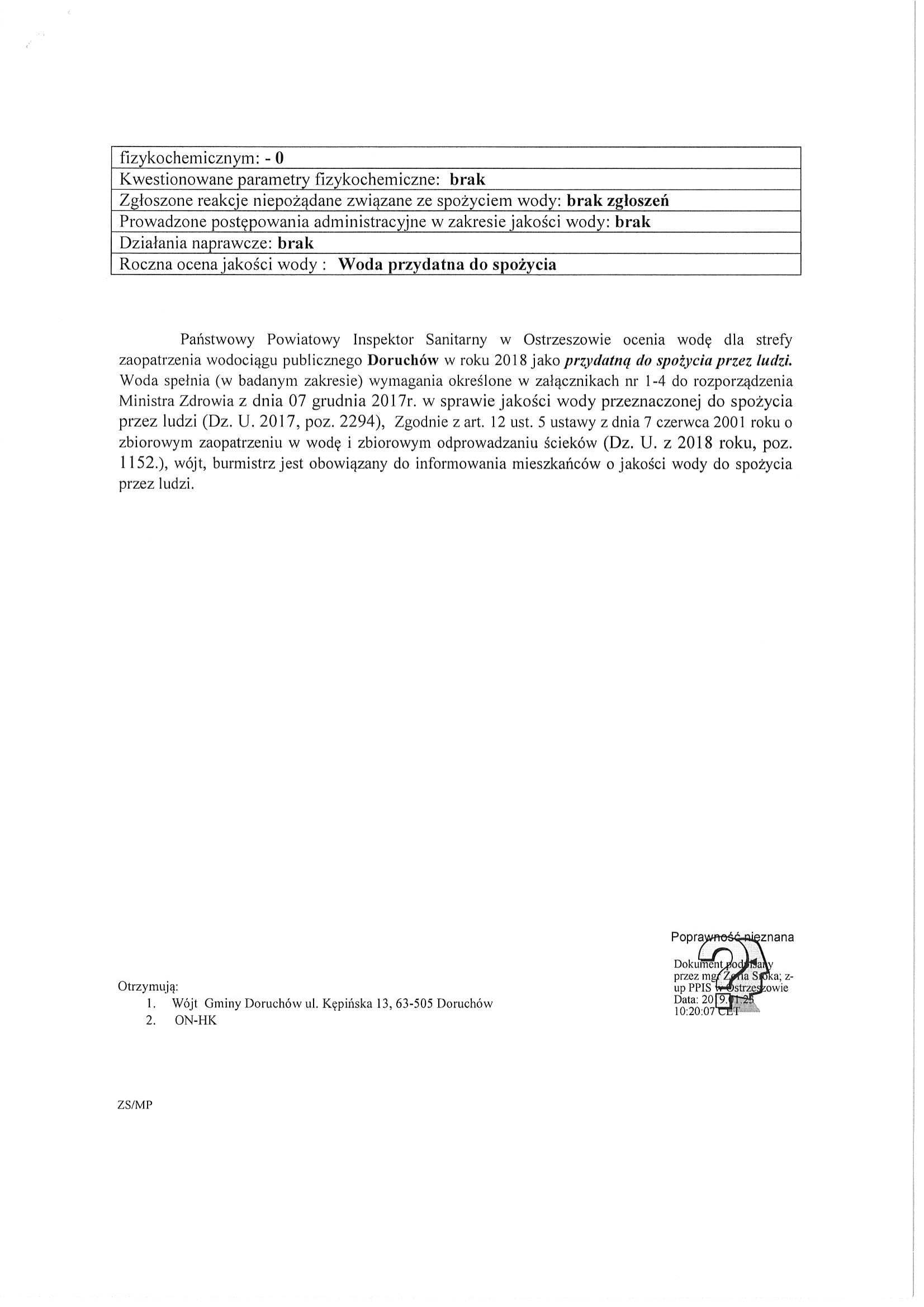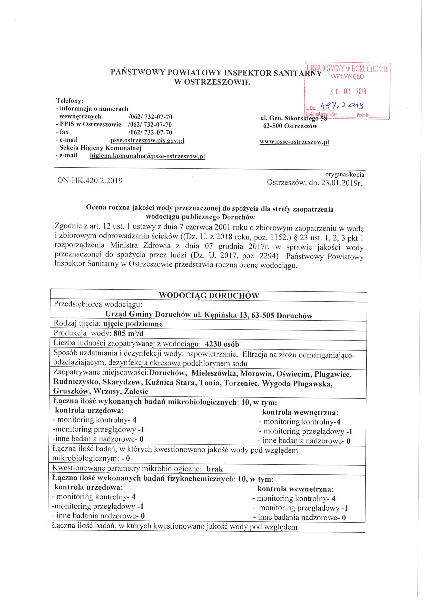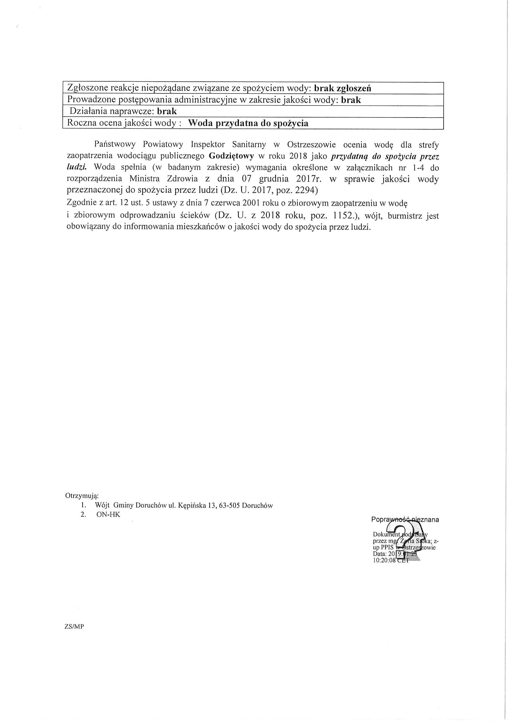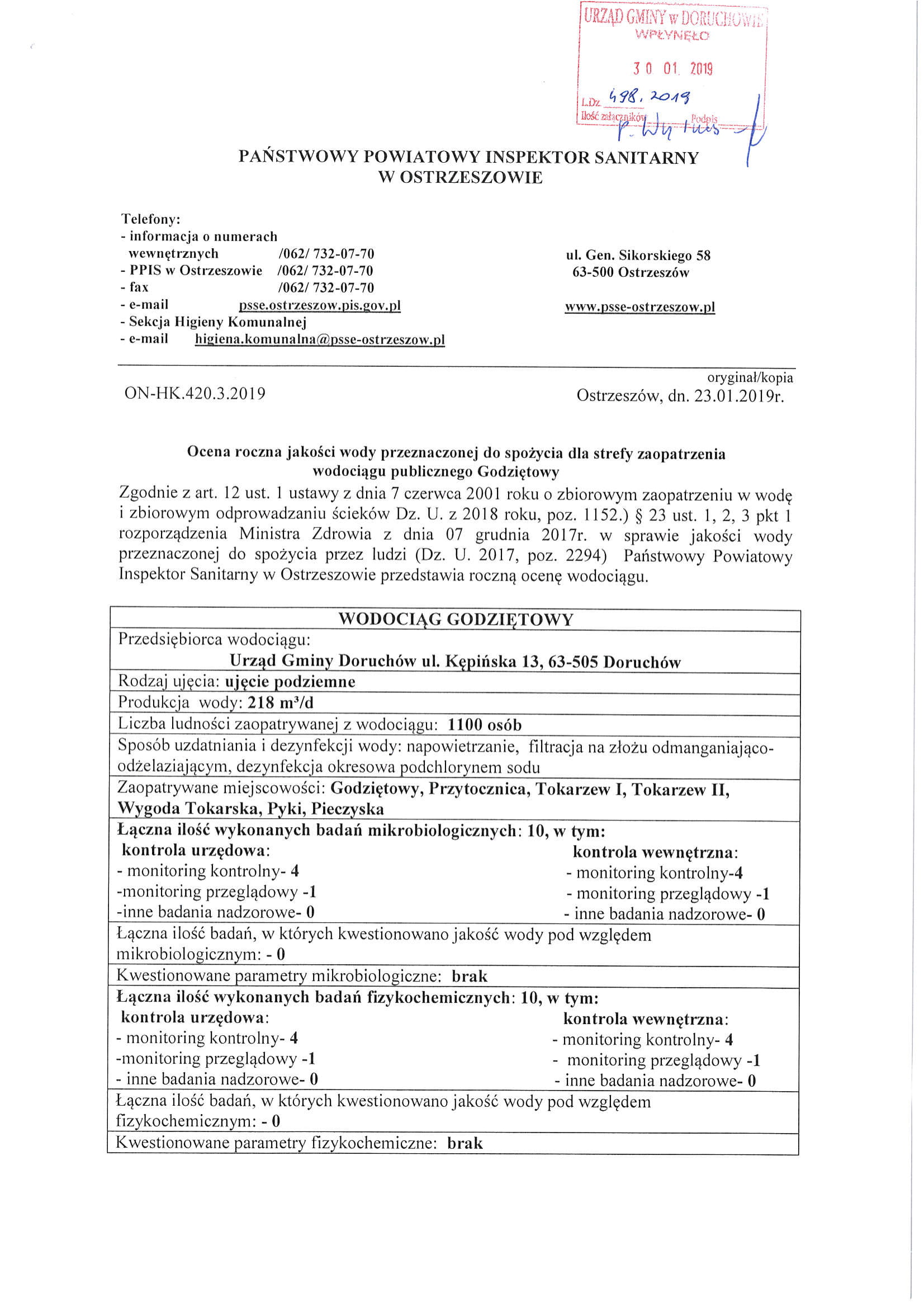 Ocena roczna jakości wody przeznaczonej do spożycia dla strefy zaopatrzenia wodociągu publicznego Godziętowy oraz Doruchów.