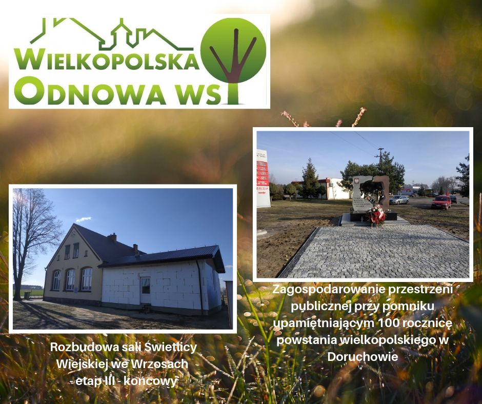 Projekty - zagospodarowanie przestrzeni przy pomniku powstania wielkopolskiego w Doruchowie oraz rozbudowa sali świetlicy wiejskiej we Wrzosach - otrzymały po 30 tys zł dofinansowania.
