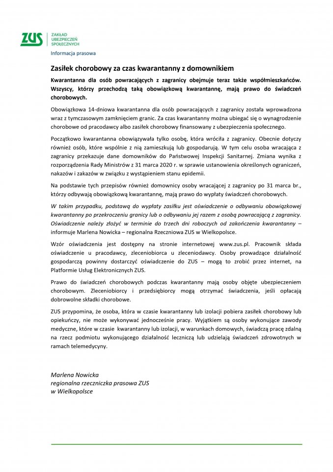 Zasiłek chorobowy za czas kwarantanny z domownikiem