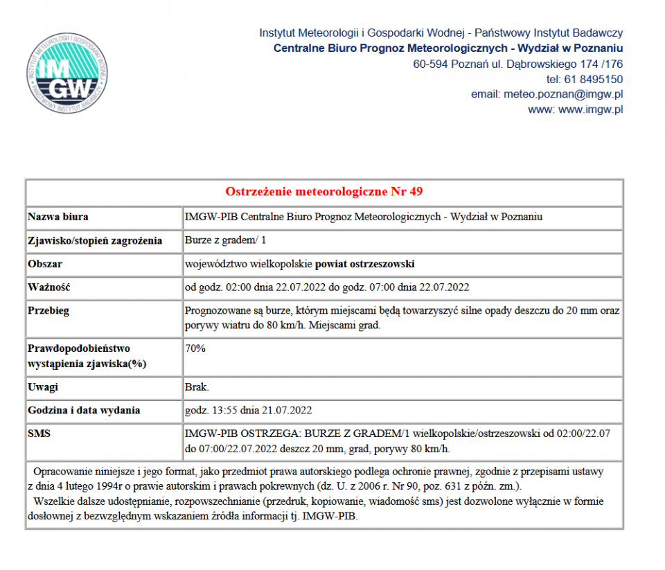 Ostrzeżenie meteorologiczne nr 49 wydane przez Biuro Prognoz Meteorologicznych w Poznaniu.