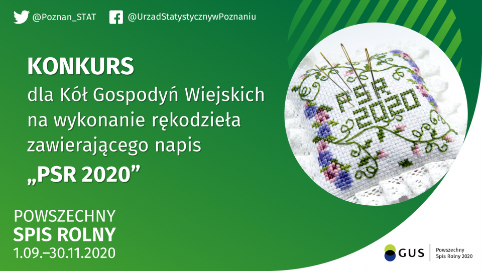 Informujemy, iż Urząd Statystyczny w Poznaniu ogłosił konkurs skierowany do kół gospodyń wiejskich. Aby uczestniczyć w konkursie należy wykonać rękodzieło zawierającego napis „PSR 2020” w dowolnej technice, np. szydełko, druty, rzeźba, haft czy pieczywo. Trzy zdjęcia rękodzieła, w formacie JPEG, należy przesłać na adres organizatora Konkurs_POZ@stat.gov.pl.