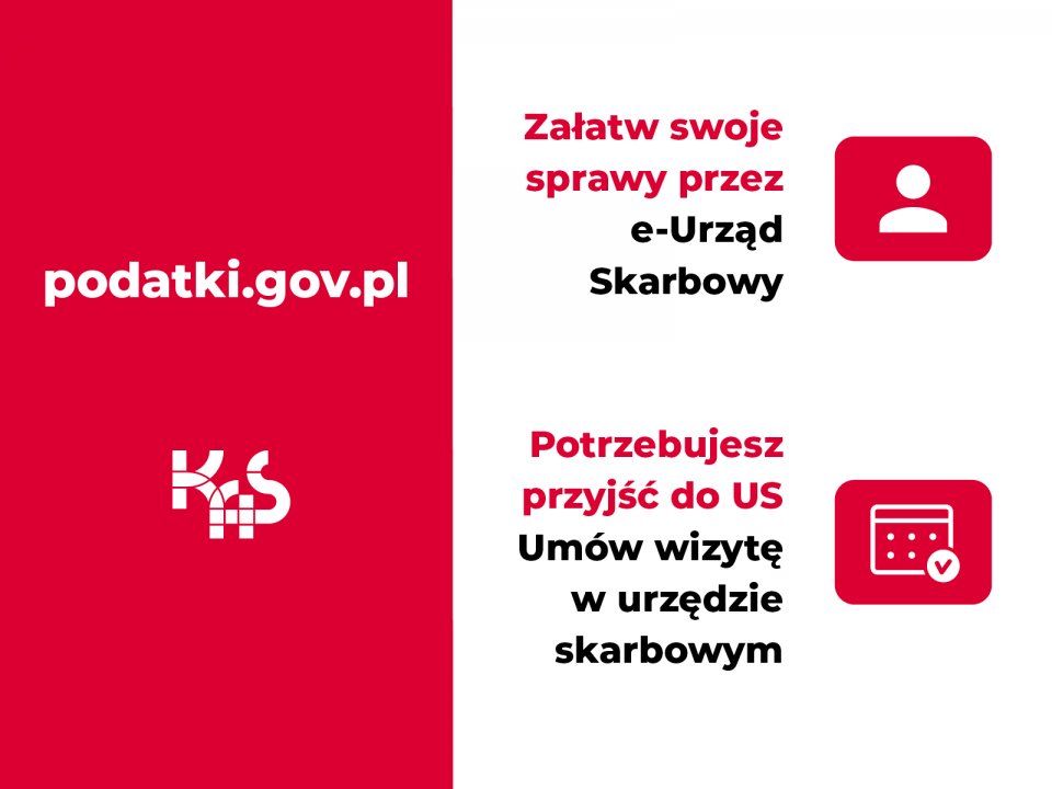 Informujemy, iż Krajowa Administracja Skarbowa mając na uwadze sytuację epidemiologiczną wprowadziła usługi „Umów wizytę w urzędzie skarbowym” oraz e-Urząd Skarbowy.