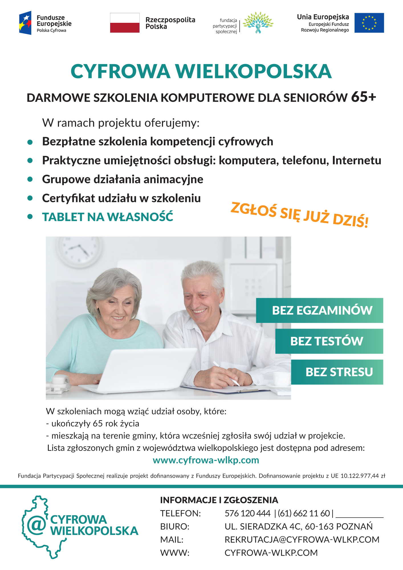 Informujemy o udziale Naszej Gminy w dofinansowanym projekcie w ramach Programu Operacyjnego Polska Cyfrowa 2014-2020 Działanie 3.1 „Działania szkoleniowe na rzecz rozwoju kompetencji cyfrowych”.