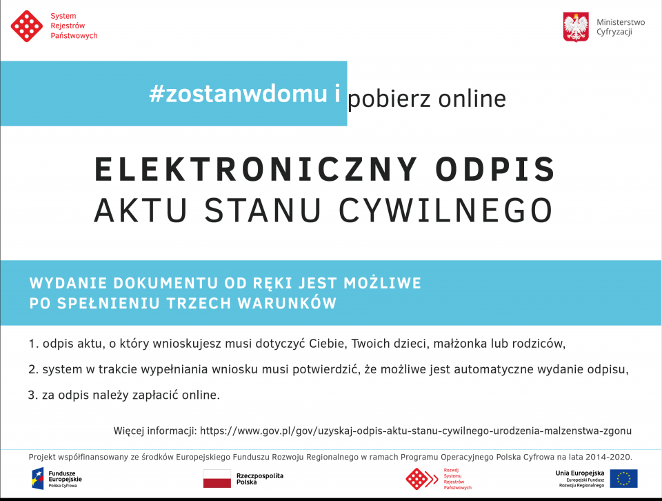 Nowa odsłona e-usługi to jedno z działań w ramach projektu Rozwój Systemu Rejestrów Państwowych POPC. Wszystkie informacje dotyczące elektronicznego składania wniosku i pobrania odpisu aktu stanu cywilnego znajdują się na rządowej stronie: