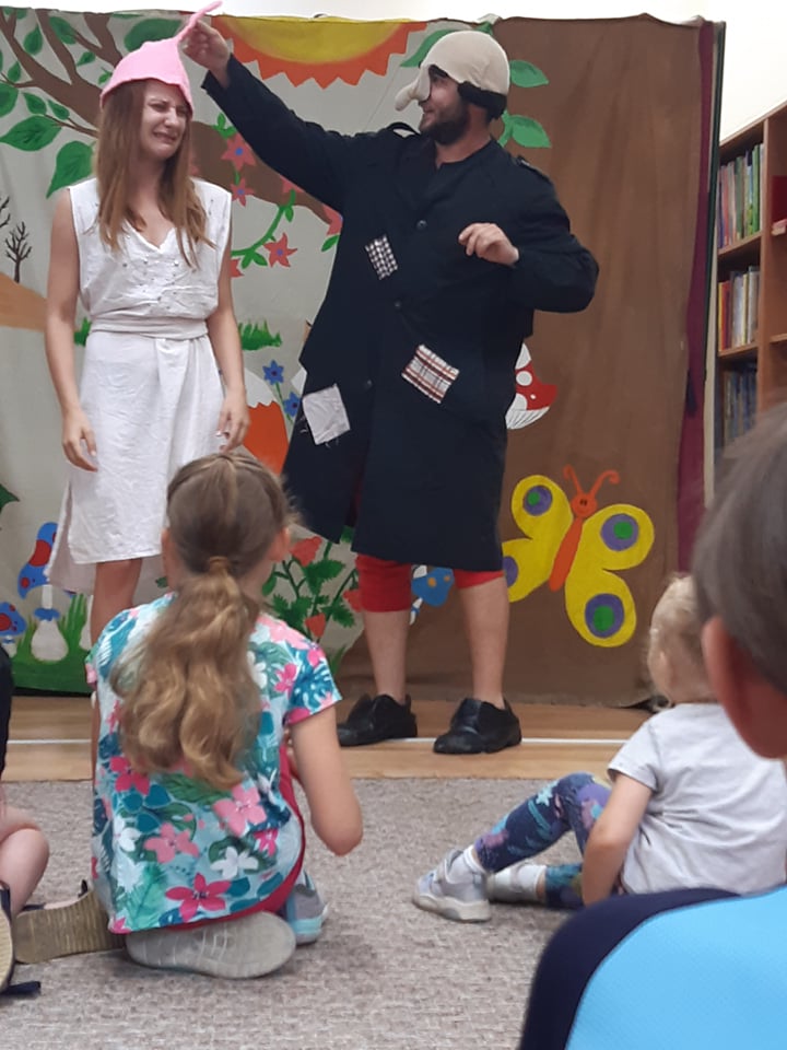 Kolejnym wydarzeniem czytelniczym było spotkanie z Teatrem Blaszany Bębenek i barwną inscenizacją „Nowy Smerfik”. Młodsi i starsi widzowie przeżyli przygody teatralnych postaci i mocno bili brawo na widok pokonanego Gargamela.