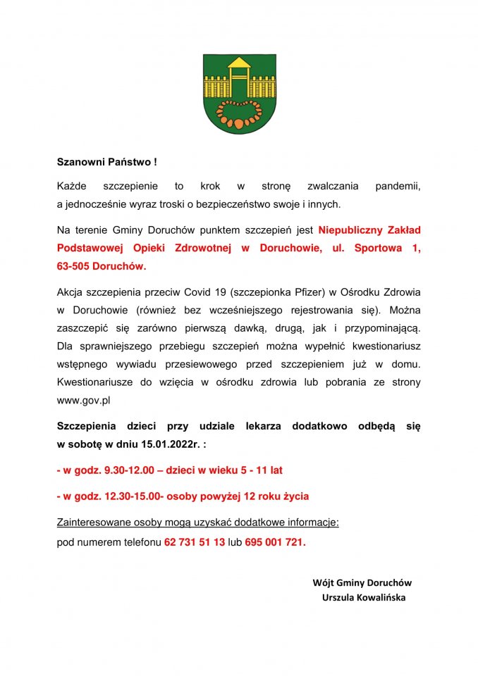 Szczepienia dzieci przy udziale lekarza dodatkowo odbędą się w sobotę w dniu 15.01.2022r.