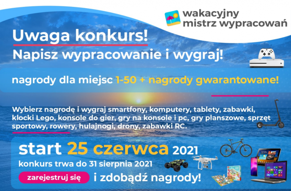 Do wzięcia udziału w konkursie Wakacyjny Mistrz Wypracowań, należy posiadać bezpłatne konto użytkownika w portalu www.dyktanda.pl oraz na poniższej stronie kliknąć w przycisk ZAPISZ SIĘ DO KONKURSU: