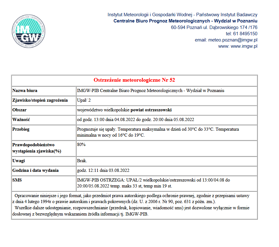 Ostrzeżenie meteorologiczne nr 52 wydane przez Biuro Prognoz Meteorologicznych w Poznaniu.