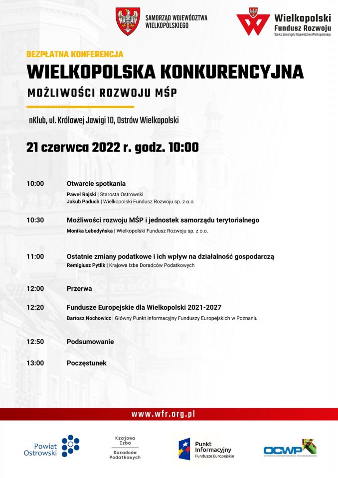 W imieniu Wielkopolskiego Funduszu Rozwoju Sp. z o.o. i Starostwa Powiatowego w Ostrowie Wielkopolskim serdecznie zapraszamy na bezpłatną i otwartą konferencję „Wielkopolska konkurencja, Możliwości rozwoju MŚP”. Konferencja odbędzie się we wtorek 21 czerwca o godzinie 10:00 w Ostrowie Wielkopolskim. Spotkanie jest dedykowane lokalnym przedsiębiorcom, przedstawicielom samorządów oraz instytucjom otoczenia biznesu.