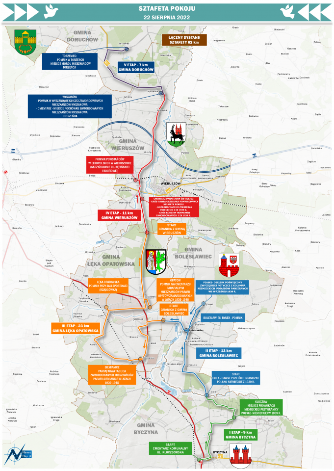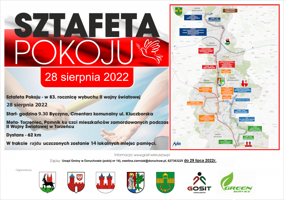 W dniu 28 sierpnia 2022r. zapraszamy wszystkich do uczestnictwa w „Sztafecie Pokoju”, organizowanej przez Gminę Doruchów oraz Gminę Wieruszów, Gminę Bolesławiec, Gminę Byczyna, Gminę Łęka Opatowska, Spółdzielnia Socjalna Green Service oraz Gminny Ośrodek Sportu i Turystyki w Wieruszowie.