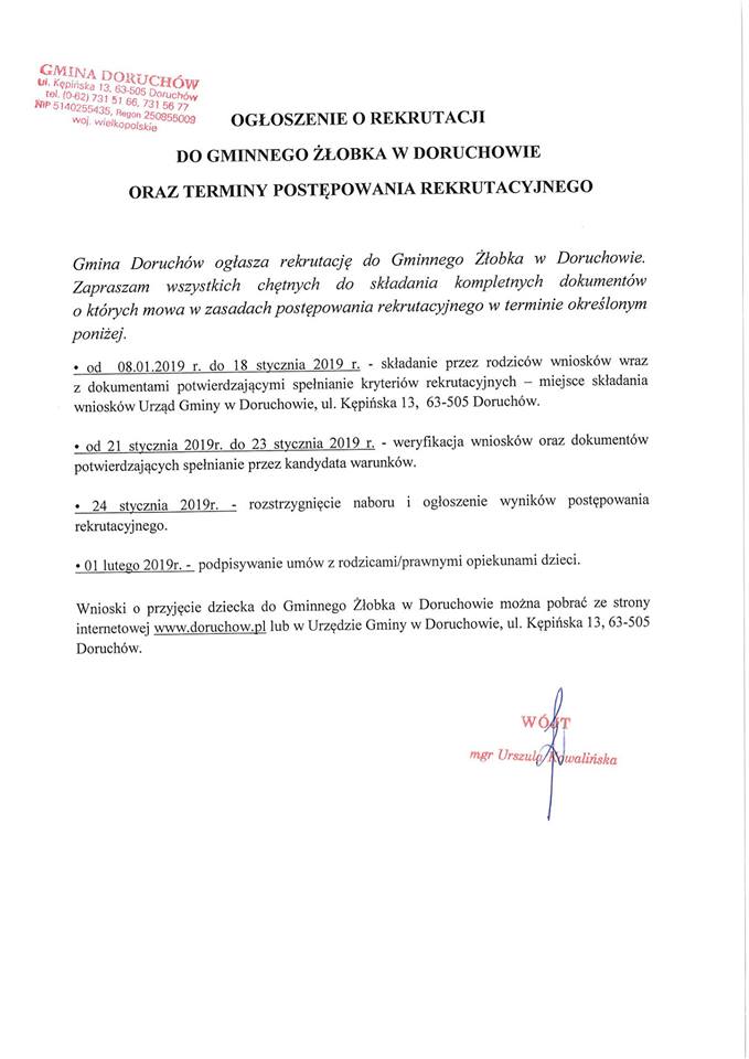 Ogłoszenie o rekrutacji do Gminnego Żłobka w Doruchowie oraz terminy postępowania rekrutacyjnego