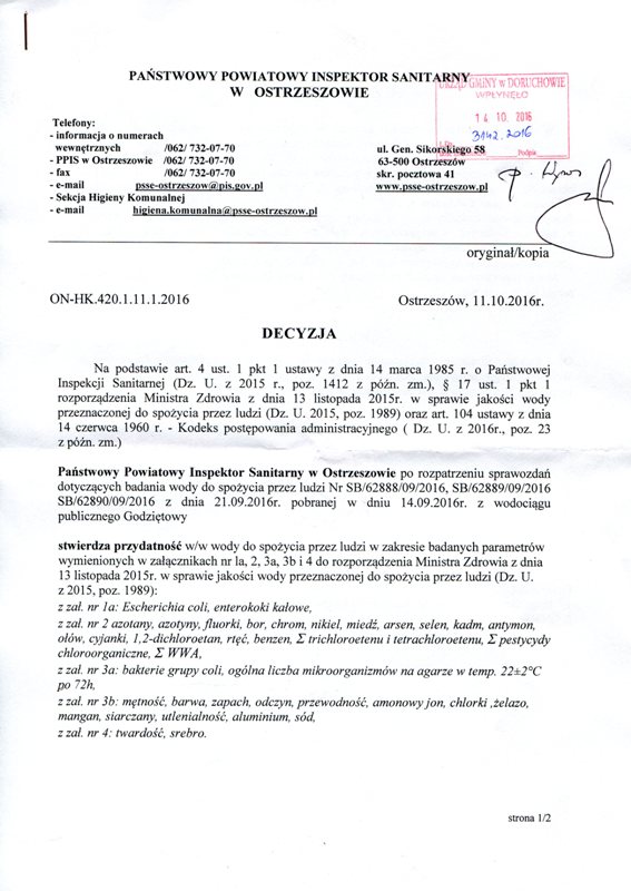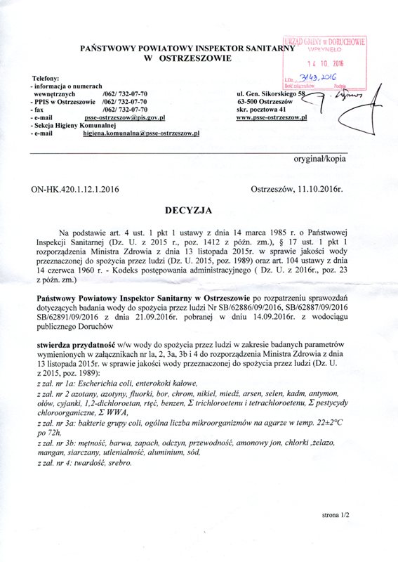 • Decyzja dotycząca punktu poboru wody w miejscowości Doruchów, Przystanek PKS, ul. Kaliska 20, budynek mieszkalny Ryszarda Kurzac w miejscowości Doruchów, budynek gospodarczy Pawła Fras w miejscowości Skarydzew 20 - pobierz