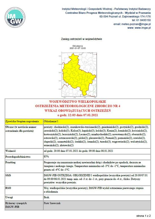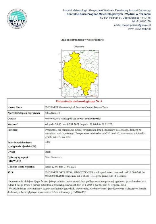 Ostrzeżenie pogodowe 07.01.2021r.