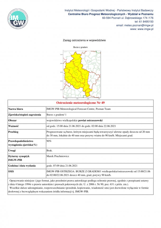 Ostrzeżenie pogodowe 21.06.2021
