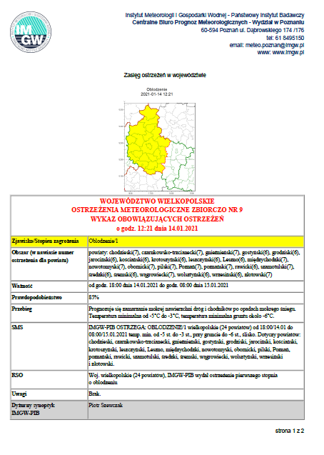 Ostrzeżenie pogodowe 14.01.2021r.
