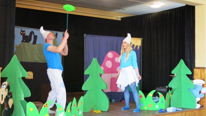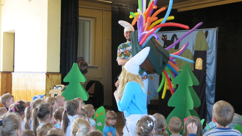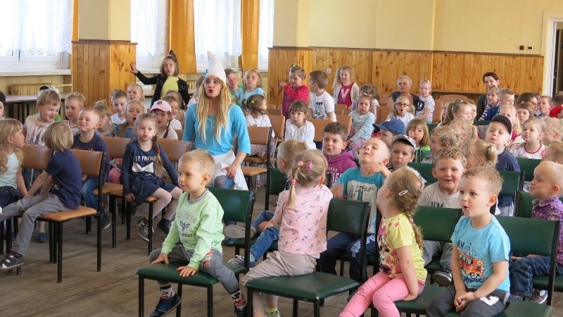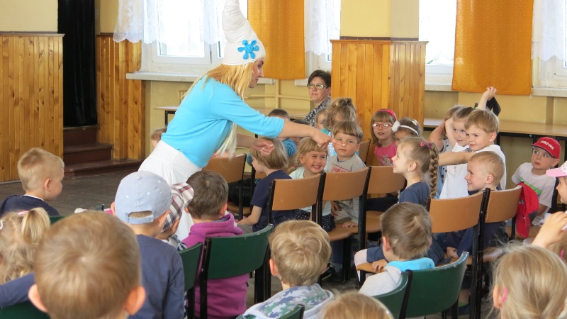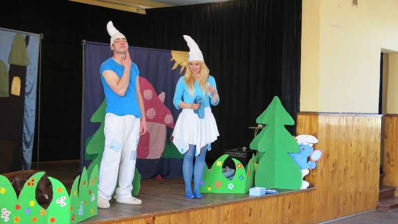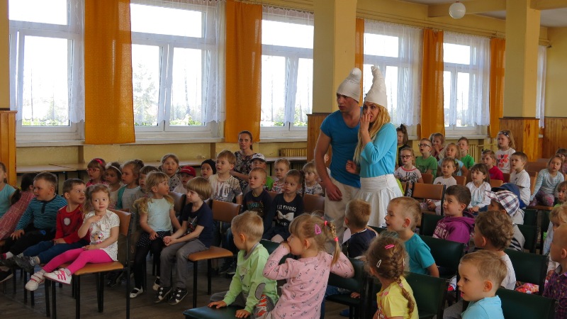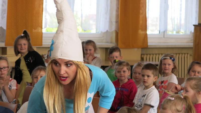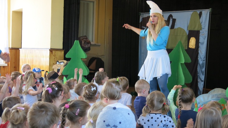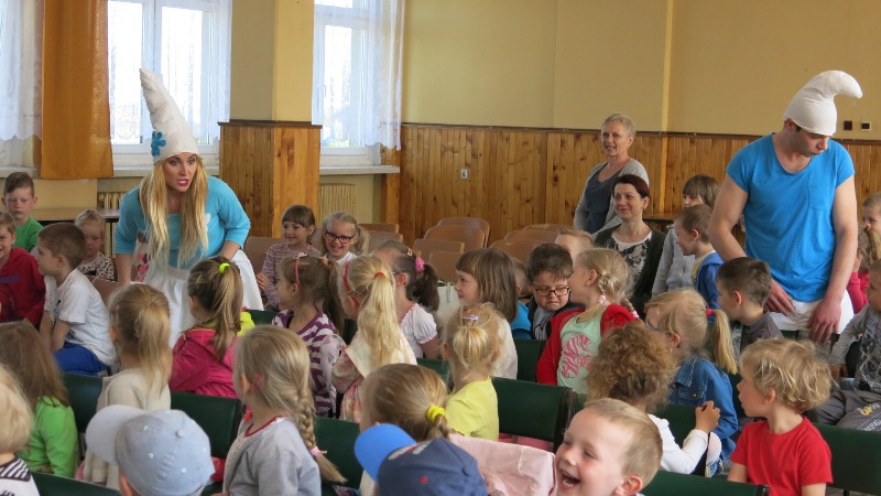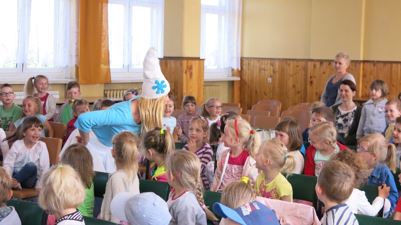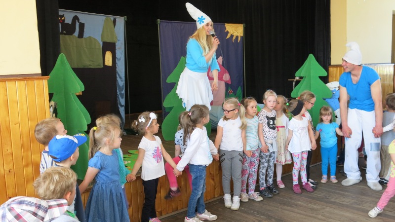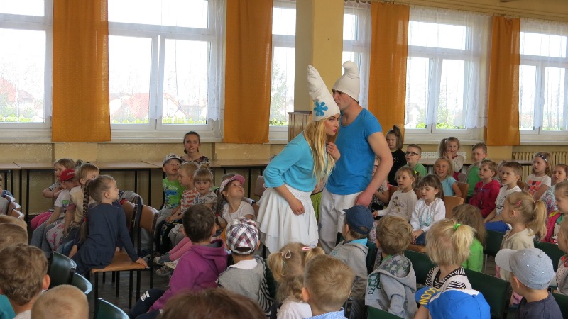 Z okazji Ogólnopolskiego Tygodnia Bibliotek, w czwartkowe przedpołudnie 12 maja, odbył się zorganizowany przez Bibliotekę Publiczną interaktywny spektakl Teatru „EDU-ARTIS” z Krakowa, pt. „Z wizytą w Smerfowym Lesie”. W przedstawieniu uczestniczyły wszystkie grupy przedszkolaków z Publicznego Przedszkola w Doruchowie. Bohaterowie znanej bajki o Smerfach: Zgrywus i Smerfetka zachęcali dzieci do dbania o środowisko, ukazując przy tym skutki zanieczyszczenia przyrody. Aktorzy zaskakiwali humorystycznymi dialogami i smerfnymi żartami. Angażowali dzieci do aktywnego udziału w spektaklu m.in. poprzez naukę smerfnej rymowanki oraz smerfnego tańca. Przedszkolaki bawiły się smerfnie:) a po zakończonej bajce wszystkie otrzymały kolorowe baloniki.