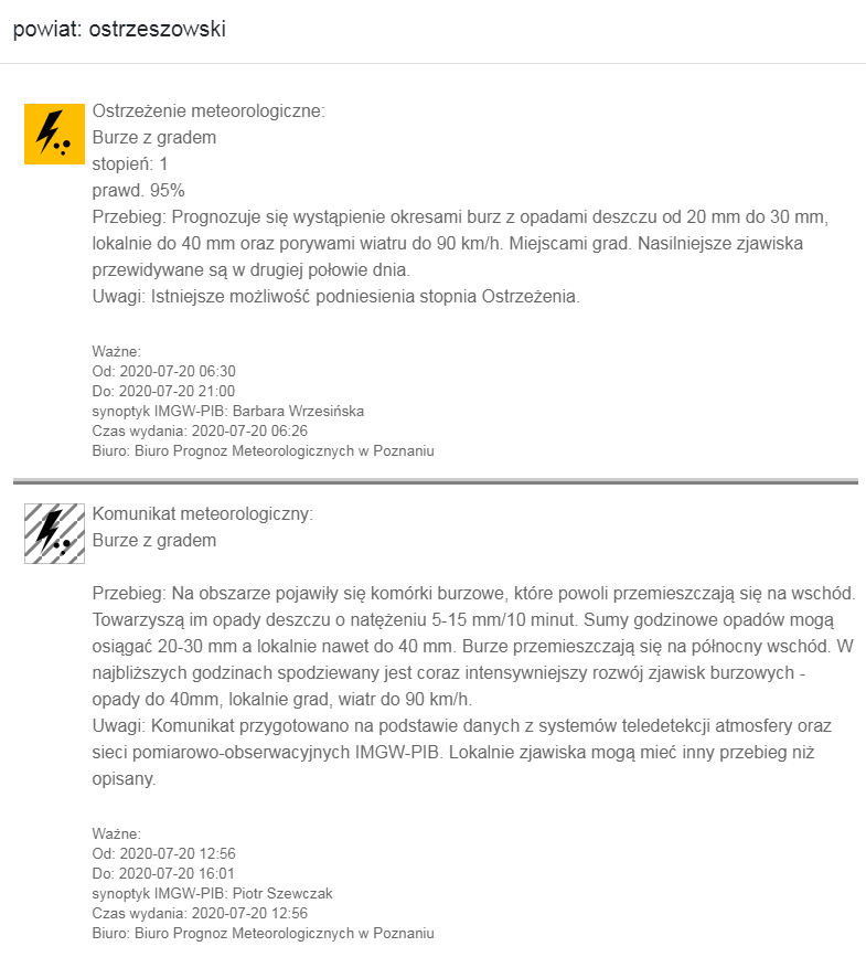 Ostrzeżenia pogodowe 20.07.2020r.