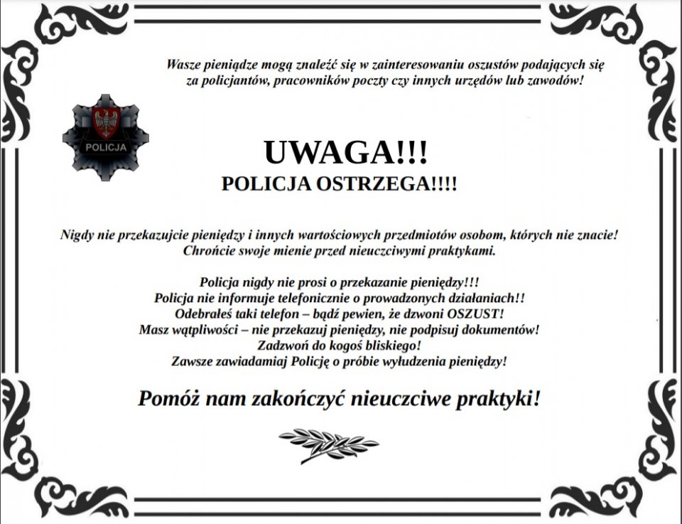 Szanowni Państwo pamiętajcie, że Policja nigdy nie będzie chciała żebyście przekazywali swoje pieniądze czy kosztowności.