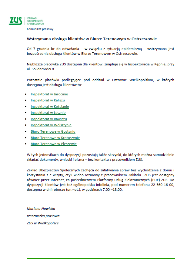 Wstrzymana obsługa klientów w Biurze Terenowym w Ostrzeszowie