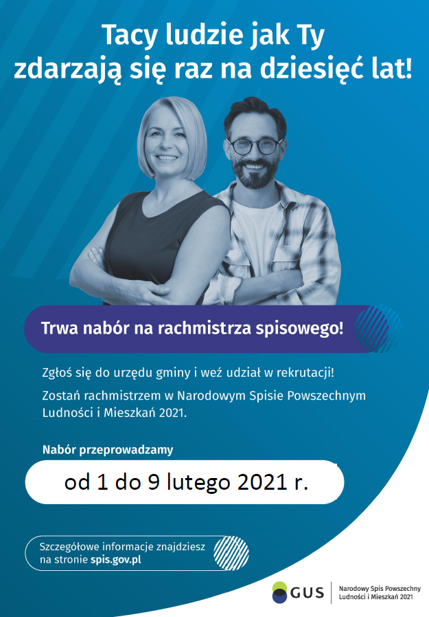 Dnia 28 stycznia 2021 r., na podstawie art. 24 ust. 1 pkt. 6 ustawy z dnia 9 sierpnia 2019 r. o narodowym spisie powszechnym ludności i mieszkań w 2021 r. (Dz.U. poz.1775, z późn.zm.) - zwany dalej NSP 2021 Pani Urszula Kowalińska - Gminny Komisarz Spisowy w Doruchowie ogłasza otwarty i konkurencyjny nabór kandydatów na rachmistrzów spisowych wykonujących czynności w ramach prac spisowych związanych z przeprowadzeniem na terytorium Rzeczpospolitej Polskiej w 2021 r. spisu powszechnego NSP 2021.