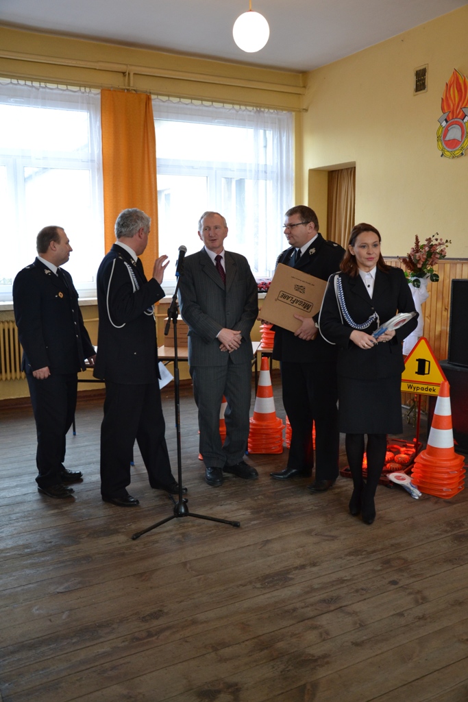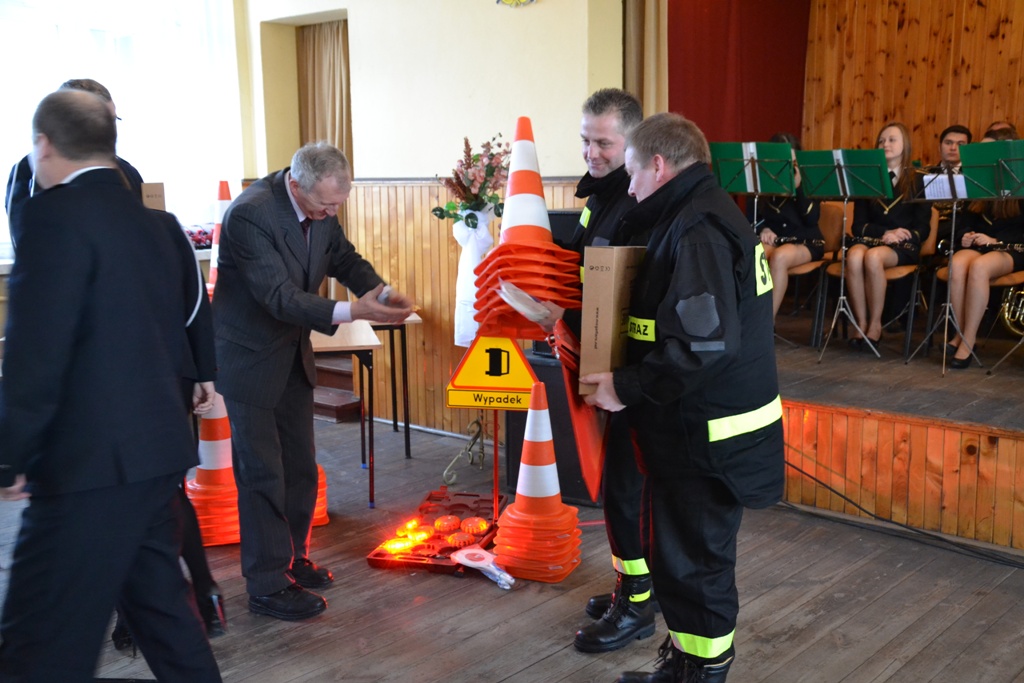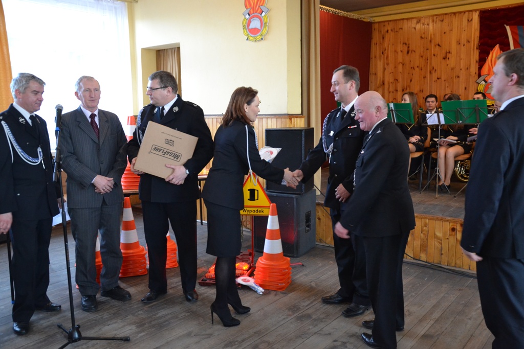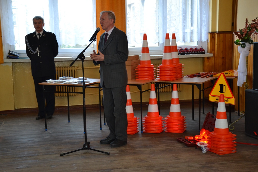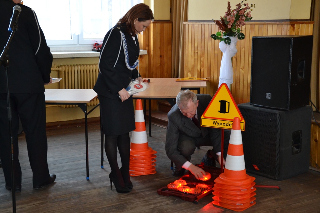 Dyrektor Wojewódzkiego Ośrodka Ruchu Drogowego w Kaliszu, Stanisław Piotrowski wraz z Panią Senator Możdżanowską, V-ce Marszałkiem Grabowskim oraz druhem Serbiakiem dokonali uroczystego przekazania sprzętu ostrzegawczego do zabezpieczania działań na drogach (tj. dyski sygnalizacyjne M-Flare, znak drogowy ostrzegający o zdarzeniu drogowym, lizaki do kierowania ruchem oraz pachołki). Sprzęt otrzymali: