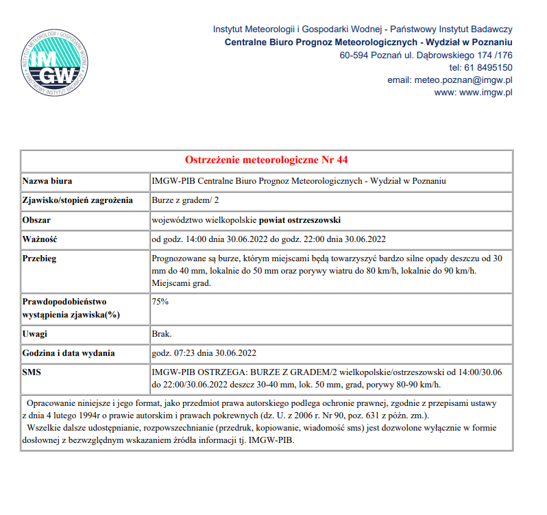 Ostrzeżenie meteorologiczne nr 44 wydane przez Biuro Prognoz Meteorologicznych w Poznaniu.