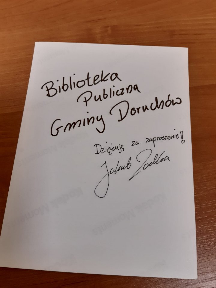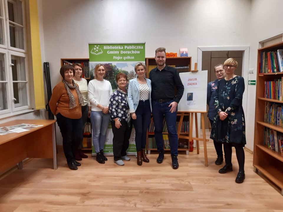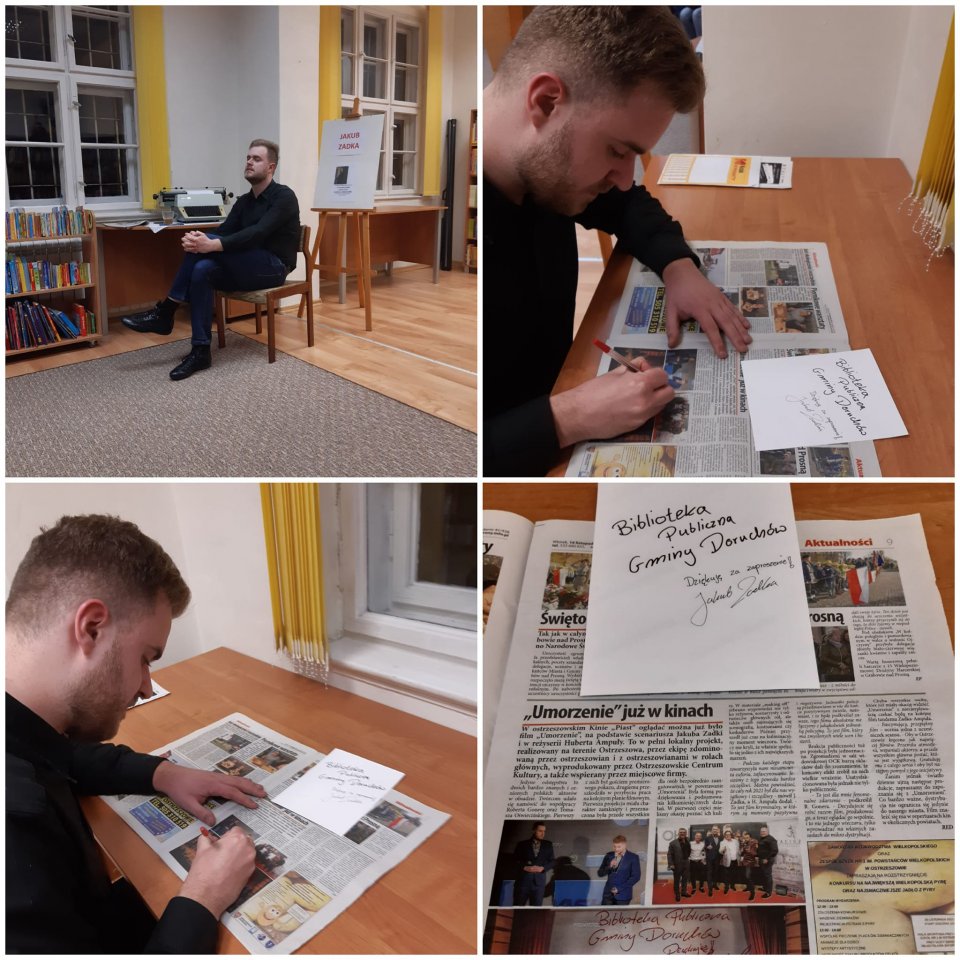 Gościem doruchowskiej biblioteki publicznej był Jakub Zadka autor scenariusza i odtwórca głównej roli filmu „Umorzenie”. Film w reżyserii Huberta Ampuły, zrealizowany przez Ostrzeszów, z fabułą umiejscowioną w naszym mieście powiatowym cieszy się ogromnym zainteresowaniem widzów. Kino pełne.Na spotkaniu z czytelnikami Jakub Spidi Zadka opowiedział o swojej drodze zawodowej. Przedstawił okoliczności narodzenia się idei nakręcenia kryminału. Opowiedział o powstawaniu scenariusza, pozyskiwaniu sponsorów, organizowaniu ekipy filmowej. Zainteresował zebranych relacją o spotkaniu z aktorami grającymi w „Umorzeniu” Robertem Gonerą i Tomaszem Oświecińskim. Barwnie odpowiedział na liczne pytania słuchaczek. Podsumowując spotkanie przyznał, że spełniło się jego marzenie. Niezwykła osobowość młodego filmowca, anegdoty, smaczki z planu oraz pytania czytelników stworzyły przemiłą atmosferę wieczoru w Bibliotece. Czekamy na kolejne filmy Jakuba Zadki.