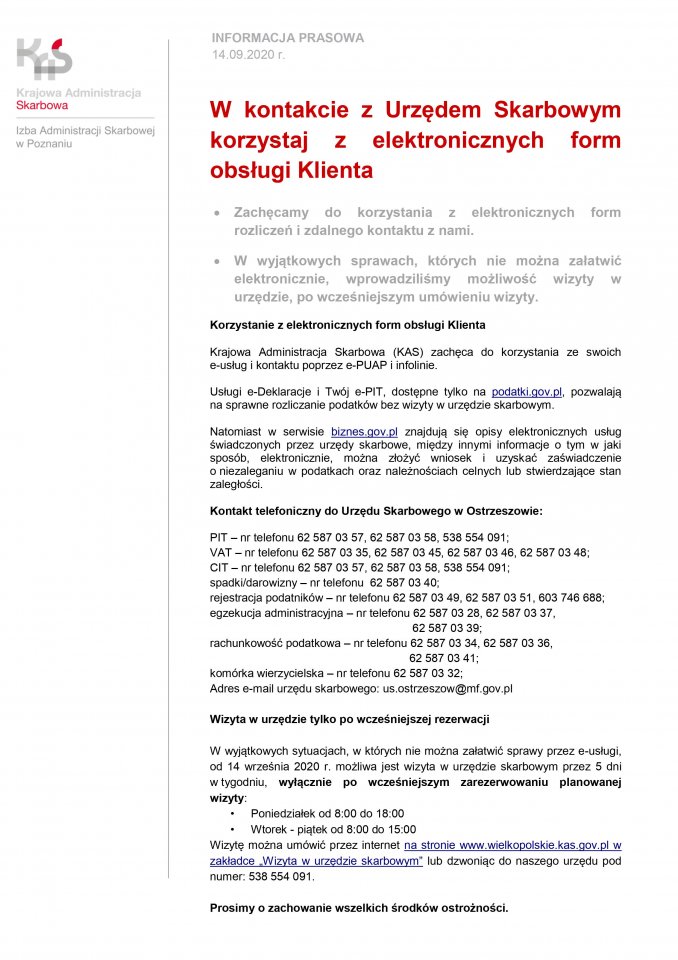 Wznowienie obsługi bezpośredniej w Urzędzie Skarbowym w Ostrzeszowie