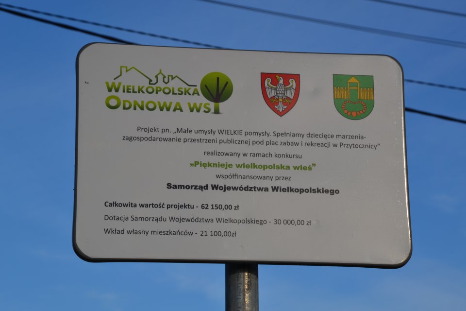 Pragniemy poinformować, iż zakończono realizację projektu pn. „Małe umysły WIELKIE pomysły. Spełniamy dziecięce marzenia - zagospodarowanie przestrzeni publicznej pod plac zabaw i rekreacji w Przytocznicy”. Zadanie obejmowało rewitalizację obecnego placu zabaw w Przytocznicy. W ramach prac utwardzono teren, wykonano teren zielony, zdemontowano, odnowiono i zamontowano ponownie wyposażenie placu zabaw, zamontowano nowe elementy małej architektury. Realizacja tego przedsięwzięcia pozwoliła na stworzenie bezpiecznego miejsca do spędzania wolnego czasu dla najmłodszych mieszkańców jak i dorosłych. Projekt współfinansowany przez Samorząd Województwa Wielkopolskiego w ramach programu „Wielkopolska Odnowa Wsi 2013-2020”. Na realizację projektu Gmina Doruchów otrzymała dofinansowanie z Urzędu Marszałkowskiego Województwa Wielkopolskiego w wysokości 30 000,00 zł w ramach konkursu "Pięknieje Wielkopolska Wieś". Całkowity koszt zadania wyniósł 62 150,00 zł.
