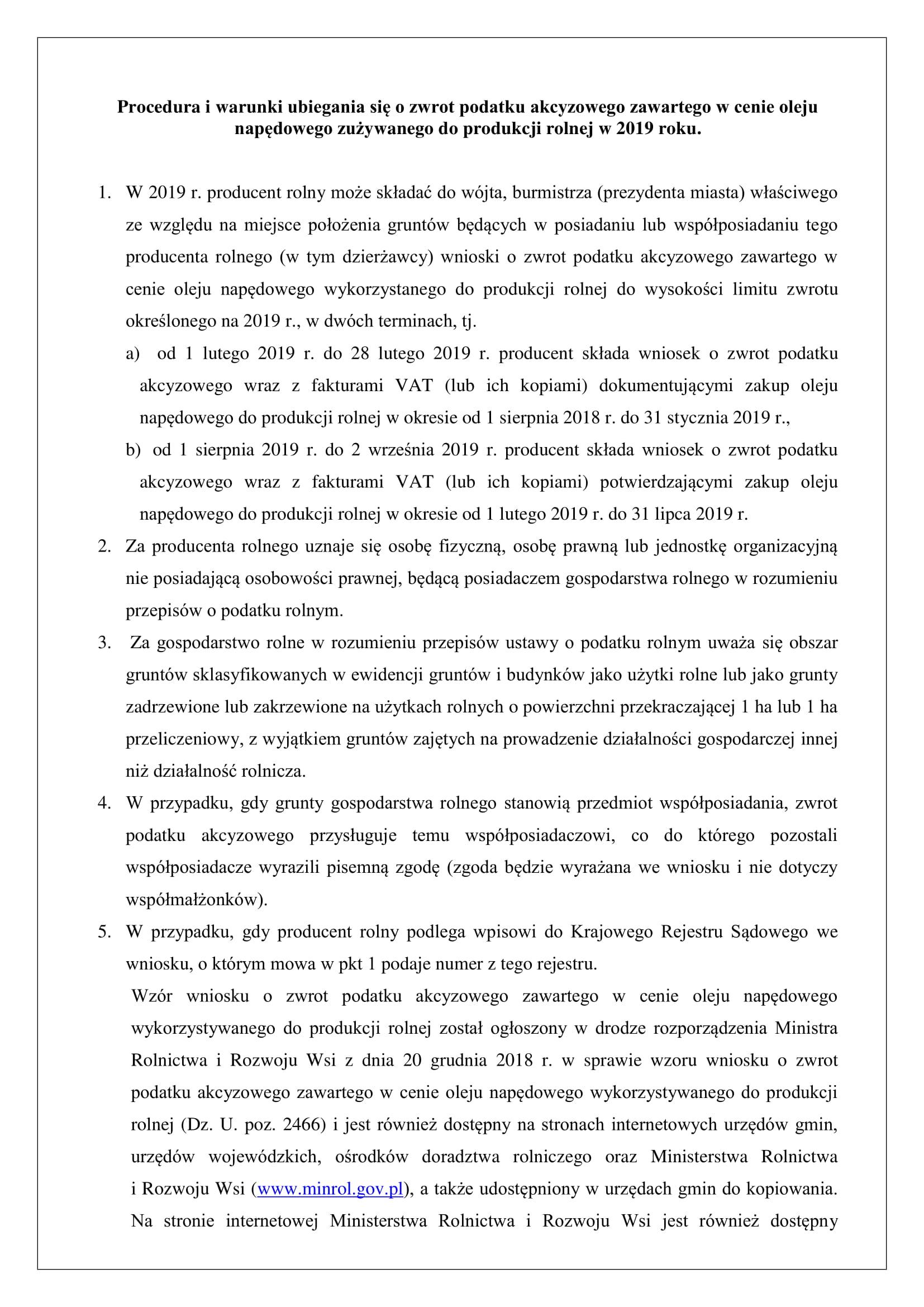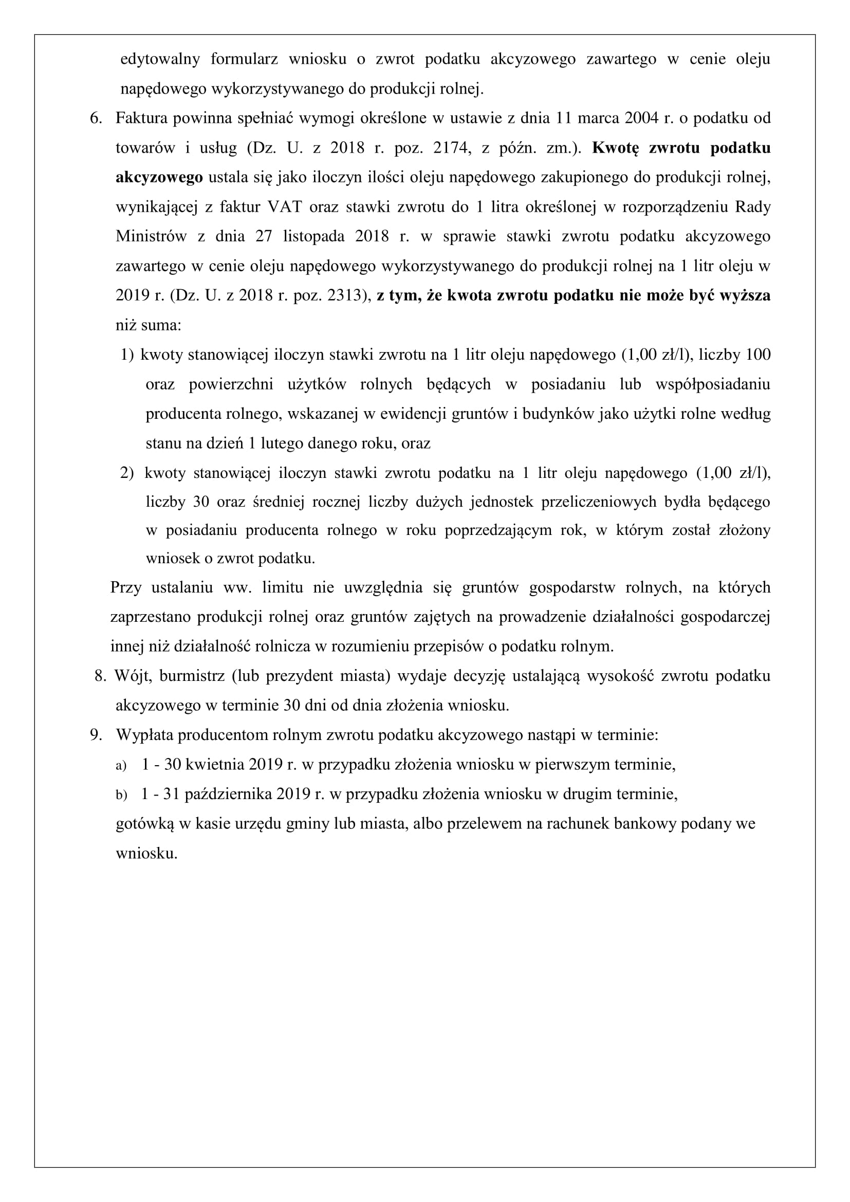 Limit zwrotu podatku w 2019 r. wynosi 100,00 zł * ilość ha użytków rolnych oraz 30,00 * średnia roczna liczba dużych jednostek przeliczeniowych bydła.