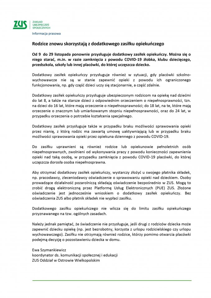 Dodatkowy zasiłek opiekuńczy w związku z COVID 19, z którego można korzystać od 9 listopada do 29 listopada 2020 r.